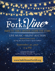 The 3rd annual “Fork & Vine” dinner and silent auction benefiting S.A.F.E. will be at the Gratidude Ranch in Leipers Fork on September 30th from 6 – 9 p.m.
