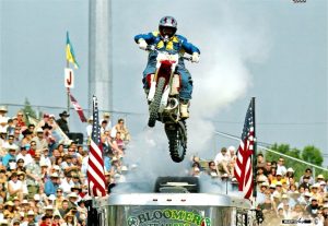 Lerwill found his niche in rodeo with his signature act: jumping a Ram truck and trailer – sixty feet in length- with his dirt bike. The jump isn’t scary, he says, but the landing can be.