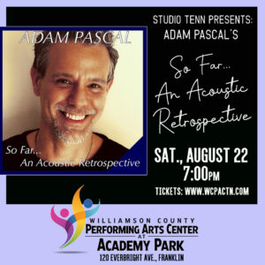 The Williamson County Parks and Recreation Department (WCPR) is proud to host a one-night cabaret-style show presented by Studio Tenn at the Williamson County Performing Arts Center, 112 Everbright Avenue, in Franklin. On Saturday, August 22, Tony-nominated actor, Adam Pascal preforms in, “So Far”, an acoustic retrospective. Show time is 7:00 p.m., with lobby and house doors opening at 6:30 p.m. Tickets are $55. Theatre operations and seating will be limited to meet social distancing requirements. Tickets and additional information are available at www.wcpactn.com.