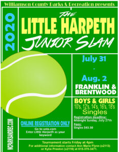 And finally, our first tennis tournament of the season will be held July 31-August 2. The Little Harpeth Junior Slam is a youth tournament for ages 10-18 and offers singles events only. The tournament is played on various courts in Brentwood and Franklin. USTA membership is required, and registration is available at www.usta.com, keyword Little Harpeth, until July 27, 2020.
