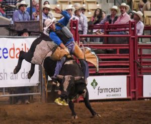 A bull rider attempts to make the eight-second buzzer at the 2017 Franklin Rodeo. VIP Corral guests at this year’s rodeo will have the chance to see the action up close and personal, with more elbow room, catered food, and adult beverages. Photo by Tom Thomson.