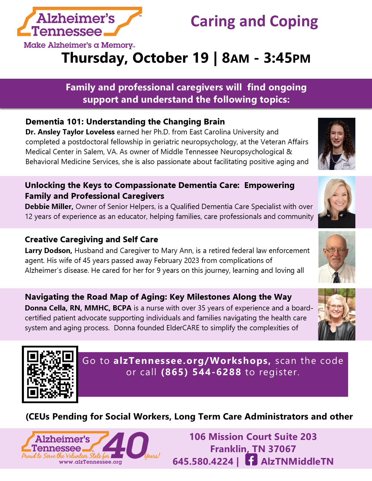 The Caring and Coping Workshop will be held at Brentwood Baptist Church on Thursday October 19. This full day workshop provides education and support to both family and professional caregivers. Attendees will learn from 4 speakers and have the opportunity to ask questions of the speakers as well as vendors who provide services to caregivers. Lunch will be provided. Registration is required. CEU’s for social workers and administrators.