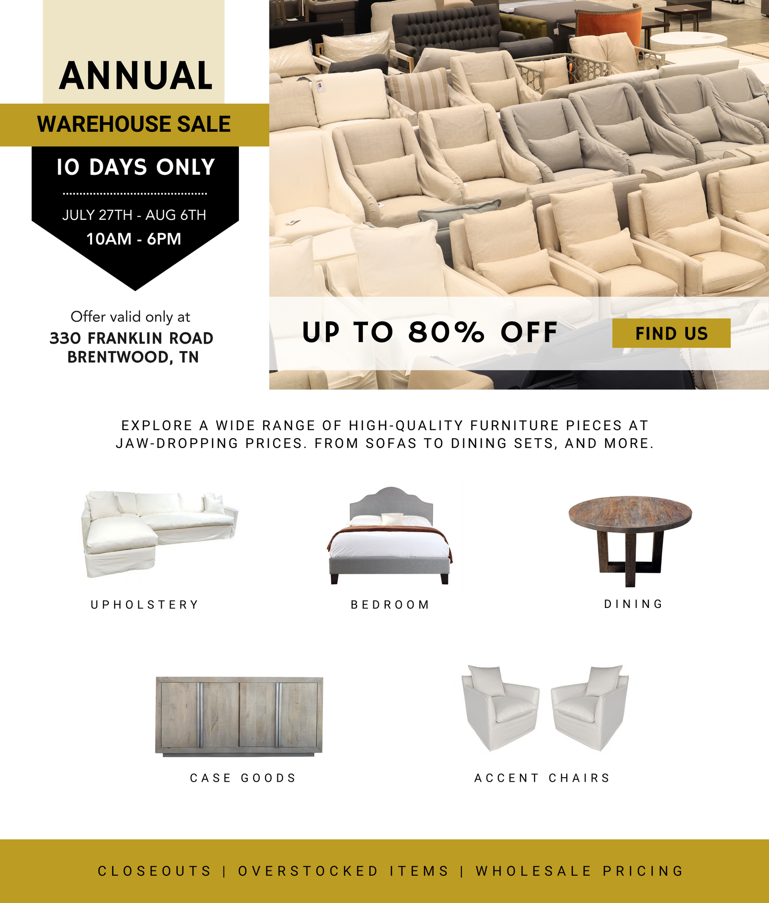 It’s that time of year again! The annual warehouse sale has arrived at Stock & Trade Design Company, and this year we’re excited to announce that it will be held at our Brentwood location July 27th – August 6th.