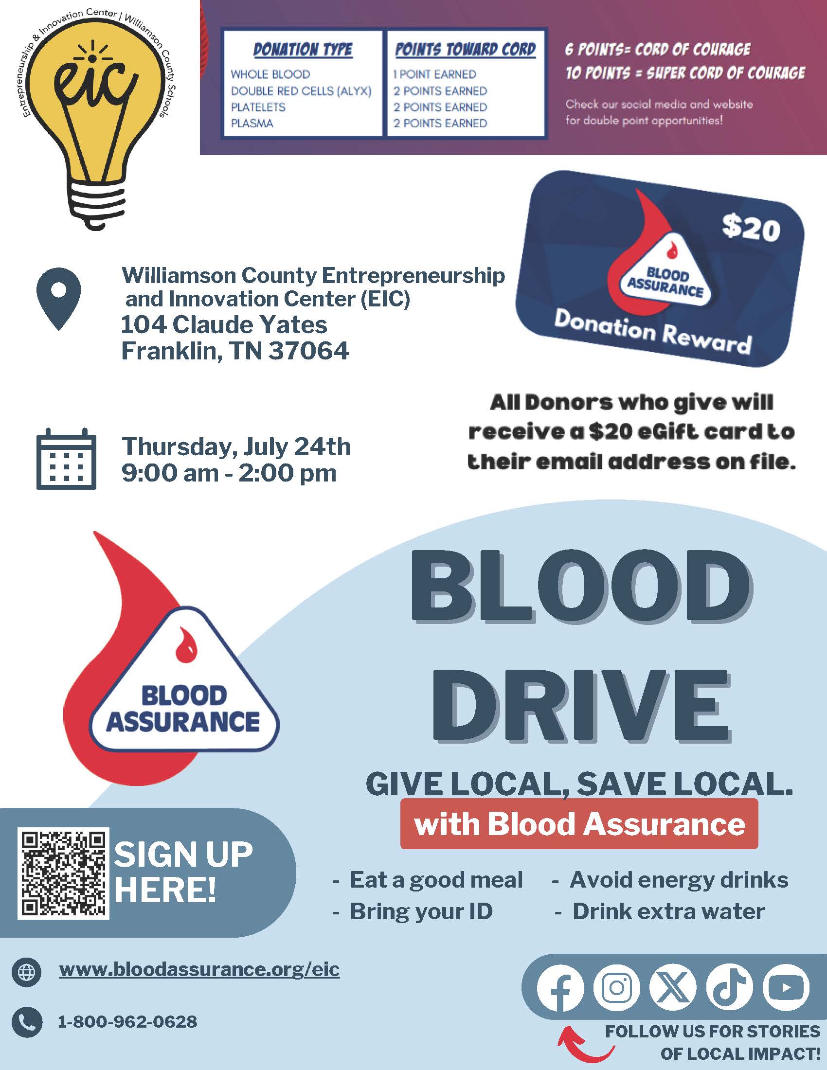 At the EIC we THRIVE on partnerships for our students! This is a partnership that has mentioned a need during the summer because most high schools aren’t able to hold blood drives during this time. This is a great opportunity to give back and help save lives – just one donation can help up to three people in need and all blood donations stay in Williamson County. All doners will receive a thank-you gift from Blood Assurance as a token of appreciation.