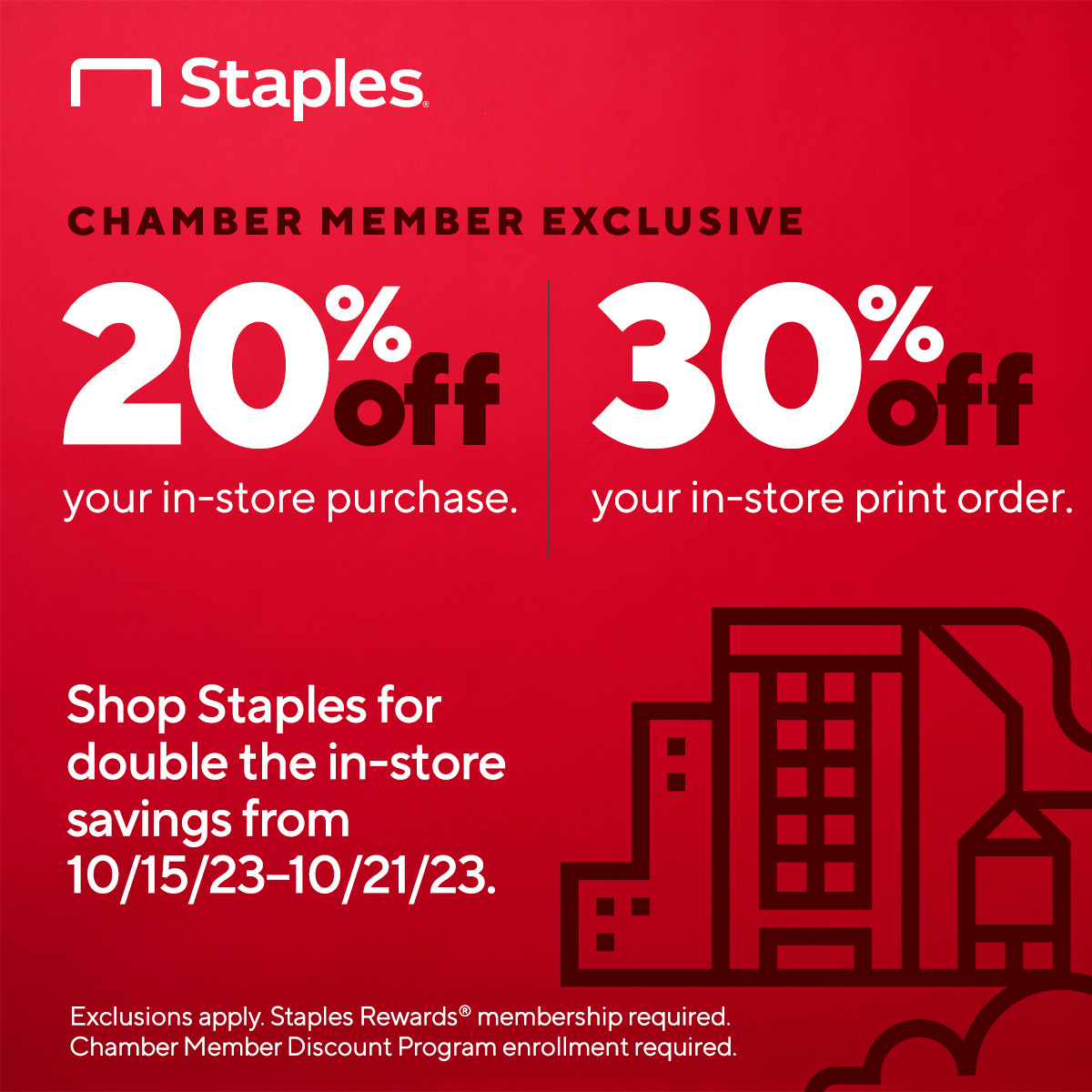As a proud supporter of Williamson, Inc., Staples is offering an in-store savings exclusively for Chamber members! Swing by my store to save all week long. Promotion runs 10/15/2023 to 10/21/2023.