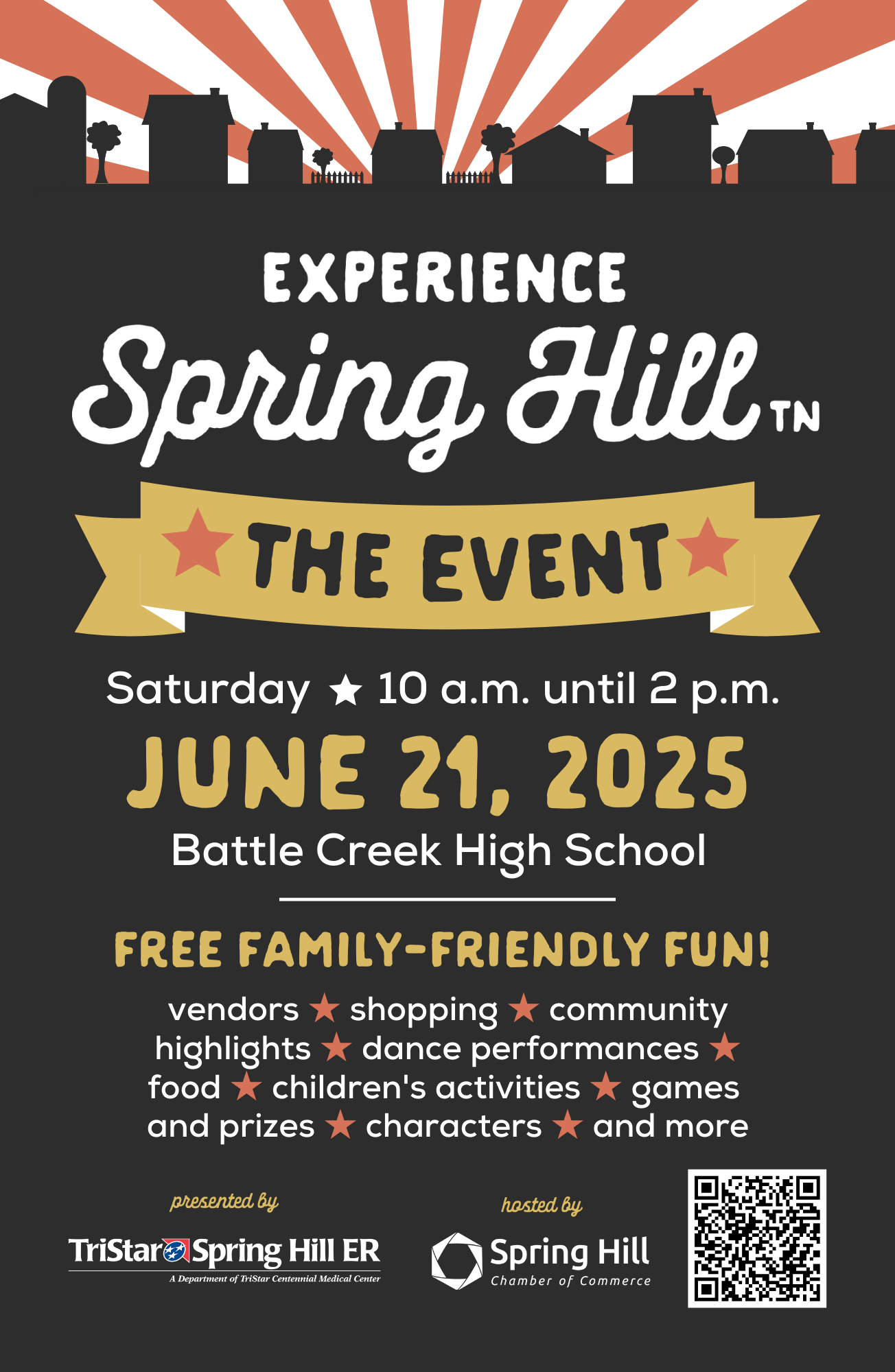 Kick off summer with a bang at ‘Experience Spring Hill, The Event’ on Saturday, June 21, 2025, from 10:00 AM to 2:00 PM at Battle Creek High School in Spring Hill, Tennessee—your gateway to the best our community offers, all in one exciting day!