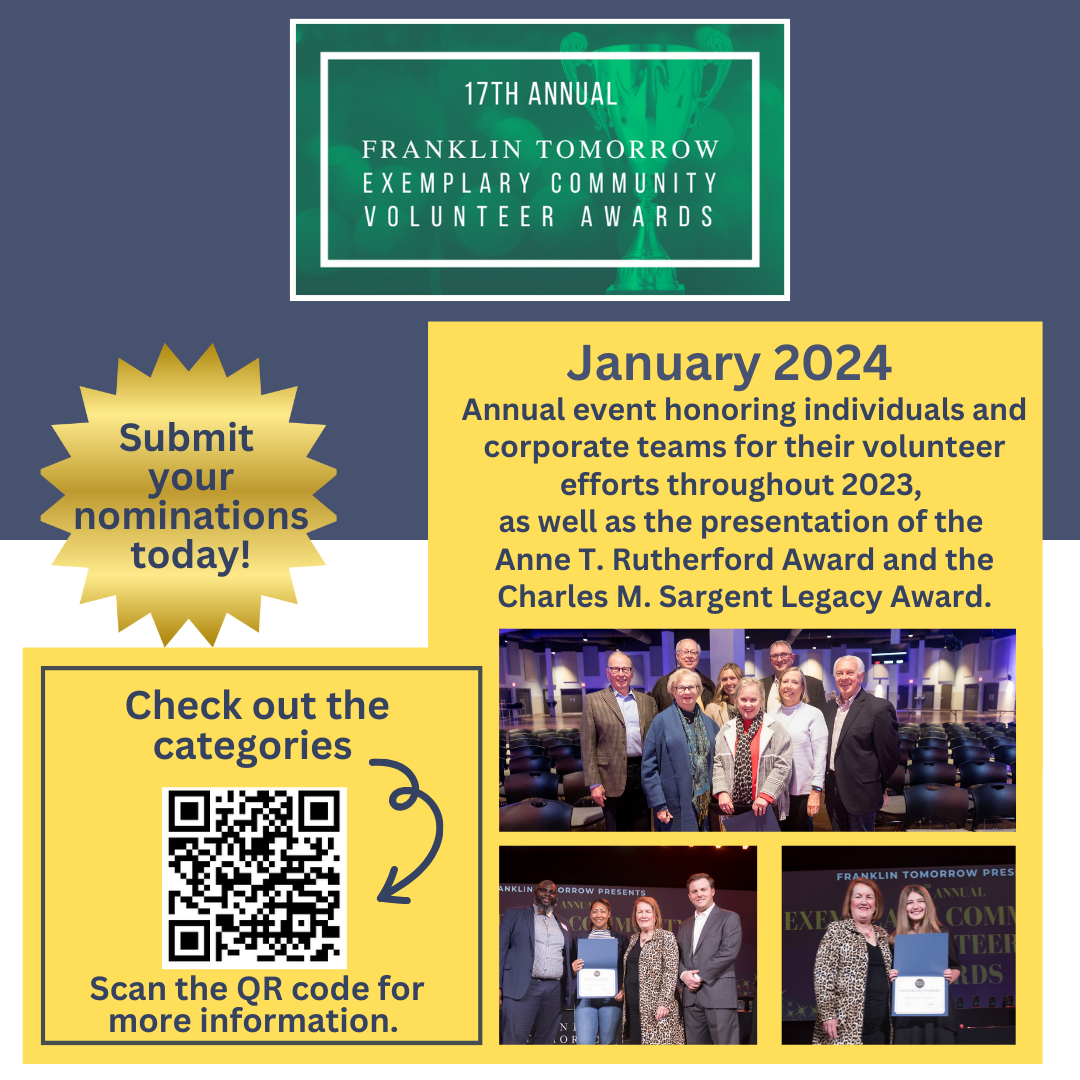 Franklin Tomorrow will also present additional awards, including the Anne T. Rutherford Exemplary Community Volunteer Award and the Charles M. Sargent Leadership Award. Franklin Tomorrow Board Chair Teresa Ashworth Harris will also have awards. These names are not announced in advance of the event.
