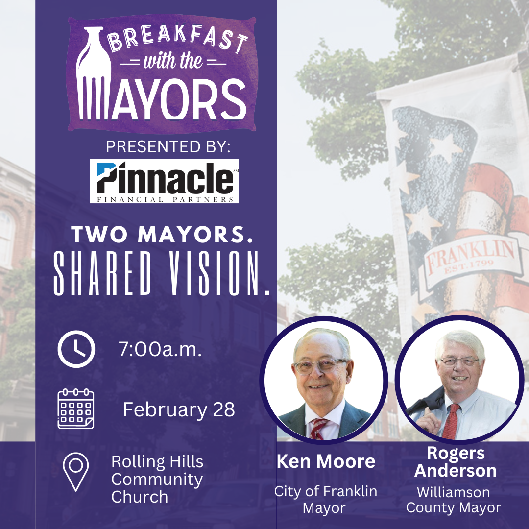 Breakfast With the Mayors is presented by our co-presenting partners, Pinnacle Financial Partners and Gresham Smith. Additional support comes from Williamson Memorial Funeral Home & Cremation Services, Hazen and Sawyer, Williamson County Association of REALTORS, Gresham Smith, Vulcan Materials, and UHY Certified Public Accountants (formerly Patterson Hardee Ballentine CPAs). Lending support for the overall work of Franklin Tomorrow are our Sustaining Partners Atmos Energy and Williamson Medical Center.