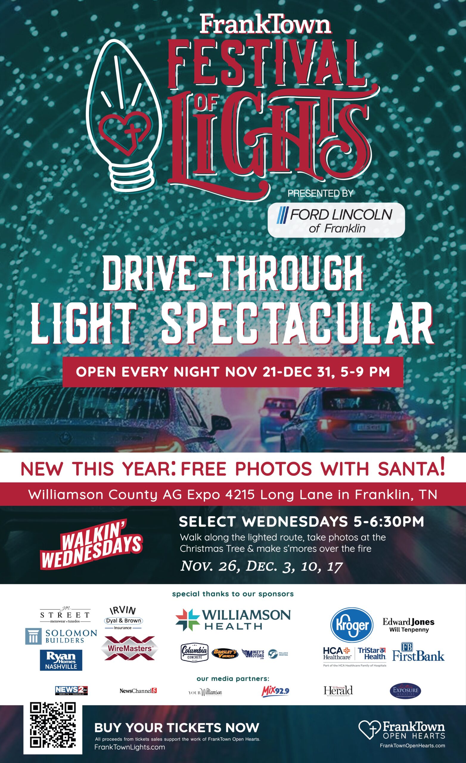 Come experience FrankTown Festival of Lights for family fun with the annual Williamson County drive-through holiday light display at the Williamson County Ag Expo at 4215 Long Lane in Franklin! Celebrate the holidays with us at our nightly mile-and-a-half light spectacular, featuring more than 200 synchronized lights. Open every night from Nov 21-Dec 31 from 5-9 PM. Listen to holiday music on your car radio, take selfies by the stunning Christmas tree, make s’mores by the fire pits, and savor snacks from the food truck. NEW THIS YEAR: FREE PHOTOS WITH SANTA! Walkin’ Wednesdays are Nov 26, Dec 3, 10 and 17 from 5-6:30 PM.