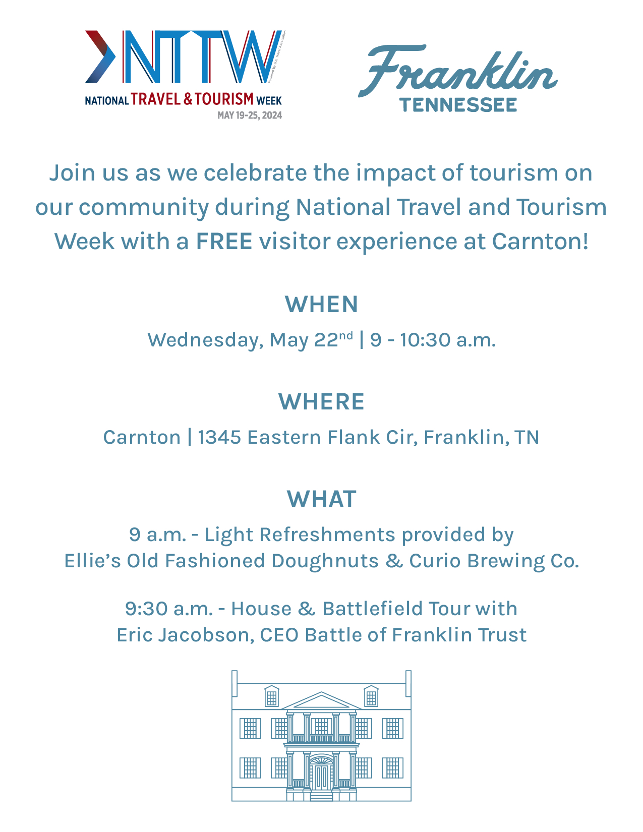Join us as we celebrate the impact of tourism on our community during National Travel and Tourism Week with a FREE visitor experience at Carnton!