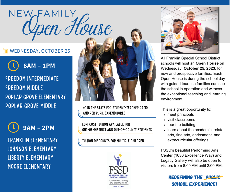 Prospective/New Family Open Houses at all FSSD schools will showcase the many ways Franklin’s public schools are providing students in pre-kindergarten through eighth grade with an exceptional education. Participants may drop in at any FSSD school to see first-hand how the curriculum is paced to provide each student with opportunities for success and how it is taught by teachers who understand the importance of building relationships and providing experiences to last a lifetime. FSSD is also open to families outside of our county on a tuition basis.