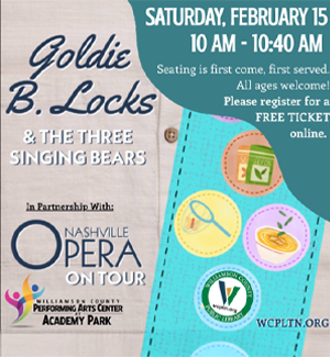 Nashville Opera at the Williamson County Performing Arts Center, Saturday, February 15th, 10:00 AM – 10:45 AM in partnership with the Williamson County Public Library. Families with children of all ages are invited to join us at the Williamson County Performing Arts Center for a performance of Goldie B. Locks and the Three Singing Bears performed by the Nashville Opera which uses Mozart and Offenbach’s music to deliver comedy and a take-away about the value of honesty, and the performance lasts around 40 minutes.