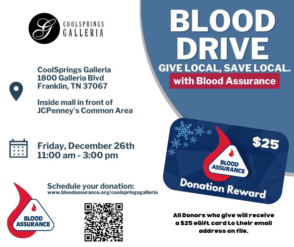 Bone and Joint Institute is hosting a public blood drive from 1pm to 6pm. Blood Assurance is the only local blood bank in Middle Tennessee, and we need your help. Please be a hero, and save three lives by donating blood today!