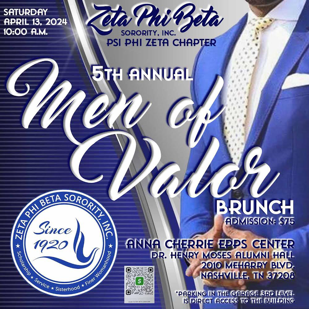 Psi Phi Zeta Chapter of Zeta Phi Beta Sorority, Incorporated is hosting our 5th Annual Men of Valor Brunch, which will be held on Saturday, April 13, 2024, at 10:00 a.m. at The Anna Cherrie Epps Center/ Dr Henry Moses Alumni Hall at Meharry Medical College, 2010 Meharry Blvd, Nashville, TN 37208. The event will…