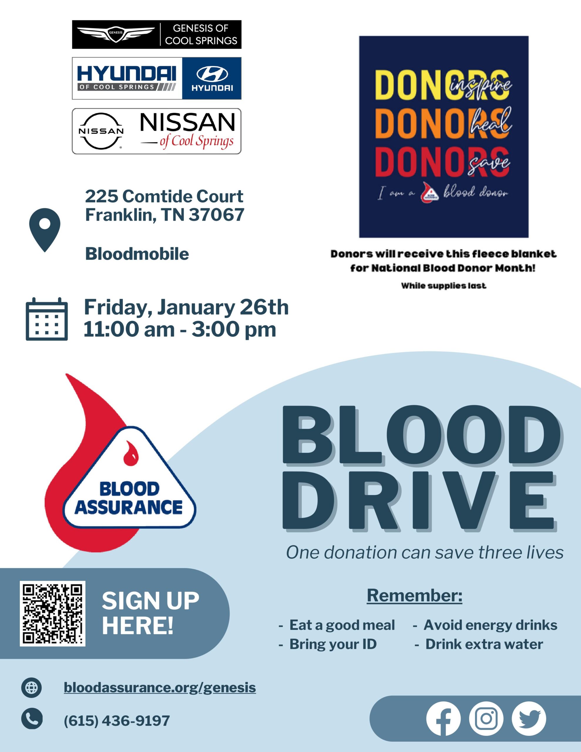 Mobile blood drive by Blood Assurance at Genesis/Nissan/Hynudai of Cool Springs to benefit Williamson Medical Center and other area hospitals. Local blood supplies are critically low and we need your help! The drive is open to the public and all donors will receive a limited fleece blanket (as pictured).