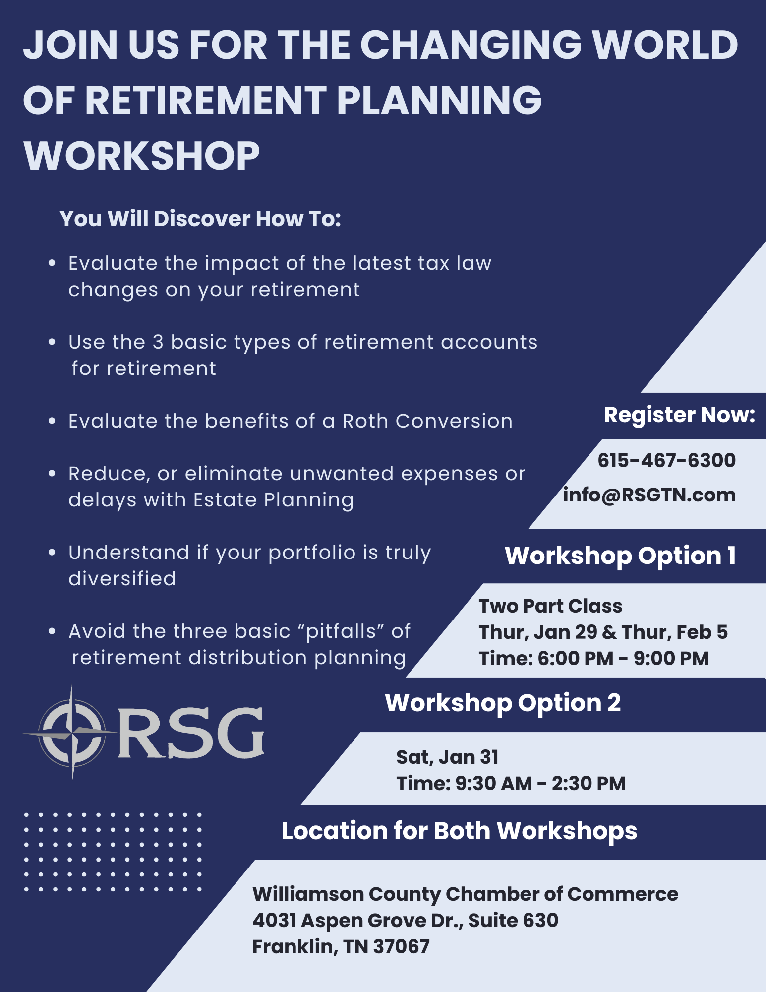 You are invited to an informational educational event for area residents who are retired or planning to retire. Dinner will be provided. REGISTER BY CALLING 615.285.5559 or visiting www.nsfe.org. COURSE…