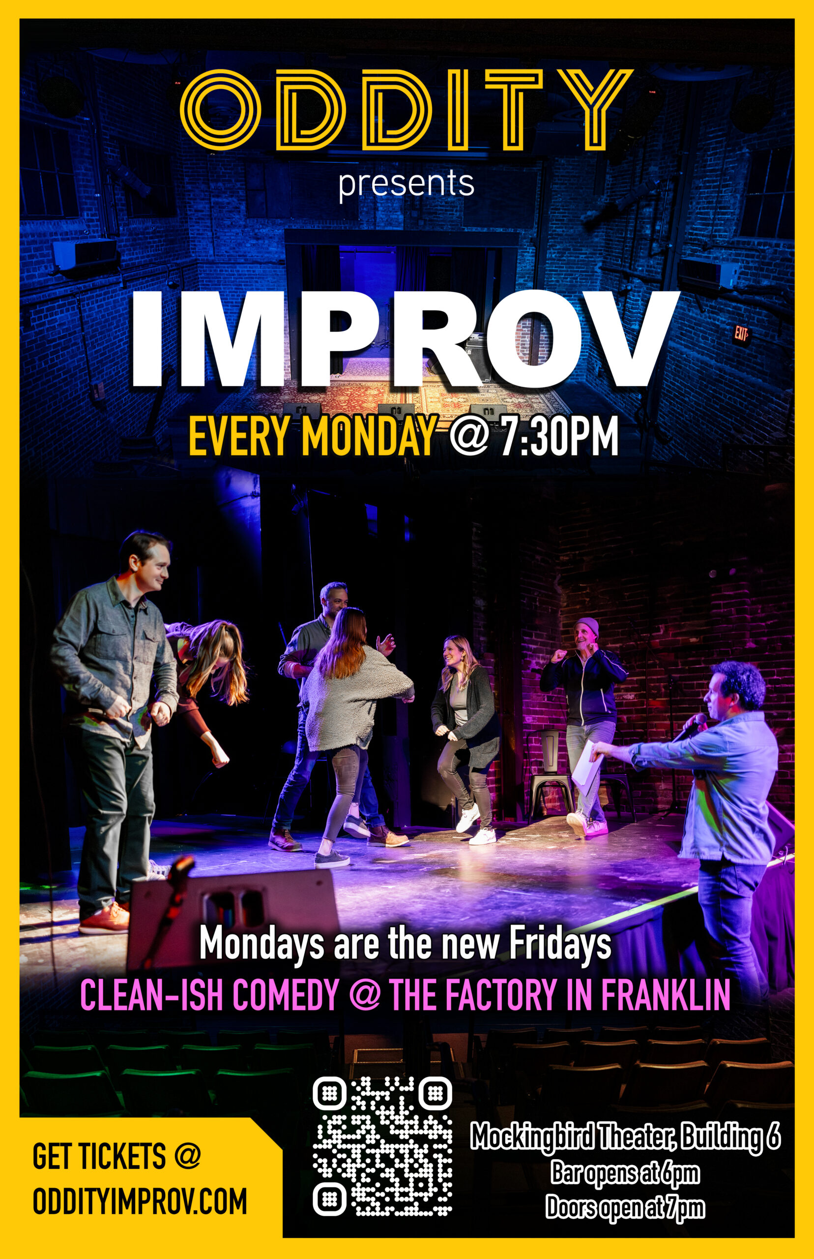 Oddity Improv is a non-profit theatre company based in Franklin, TN on a mission to empower and build confidence through the joy of improv and sketch-comedy. Every Monday night we perform clean-ish improv shows at the Mockingbird Theatre! Our talented performers will deliver unique performances keeping you entertained with their quick wit and hilarious antics. Bring your friends and family for a fun-filled evening you won’t forget! Tickets are available for purchase online at www.oddityimprov.com. Bar opens at 6pm; doors at 7pm. Ideal for ages 13 and up – see you there!