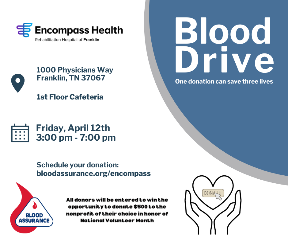 Encompass Health is hosting a public blood drive with Blood Assurance. Blood and blood products collected by blood assurance go to your friends and neighbors right here in Williamson County. One blood donation can save up to three lives! Please schedule your donation today.