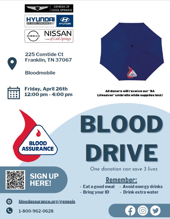 Hyundai, Nissan and Genesis of Cool springs is is hosting a public blood drive with Blood Assurance. Blood and blood products collected by blood assurance go to your friends and neighbors right here in Williamson County. One blood donation can save up to three lives! Please schedule your donation today.