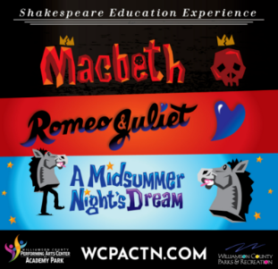 TWO nights only! The Nashville Shakespeare Festival presents Shakespeare Education Experience directed by Nashville Shakespeare Festival’s Artistic Executive Director Denice Hicks. Join us on Thursday April 27th for a presentation of MACBETH (1 hour) & A MIDSUMMER NIGHT’S DREAM (30 minutes), and Friday, April 28th for ROMEO & JULIET (60 MINUTES) & A MIDSUMMER NIGHT’S DREAM (30 MINUTES). Five actors play multiple roles with minimal set and props, demonstrating the clarity and power of Shakespeare’s poetry from three of his most popular works. These three plays are touring the Mid-South region to remind us of the relevance of the stories, the importance of imagination and the joy of live theater. All ages are welcome, although MACBETH and ROMEO & JULIET deal with mature themes. For further information visit www.nashvilleshakes.org