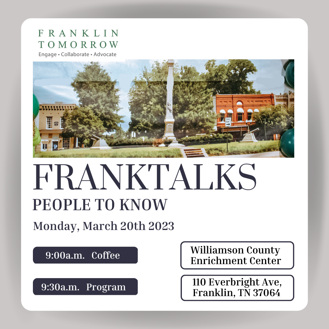 Franklin Tomorrow's FrankTalks has a new date and location for March. The event will be held on Monday, March 20, at the Williamson County Enrichment Center located at 110 Everbright Ave in Franklin, TN 37064. It will begin at 9 a.m. with a coffee social and the program at 9:30 a.m. The theme for this…
