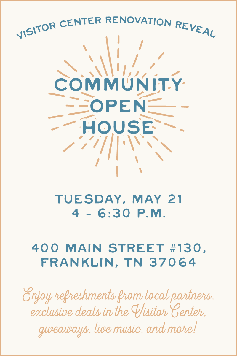 We invite you to join us for an exclusive look at the newly renovated Visitor Center in downtown Franklin. We will have remarks from Vice Mayor Matt Brown and Visit Franklin’s President & CEO Maureen Thornton at 4:15 p.m. Attendees can then tour the space and enjoy refreshments.