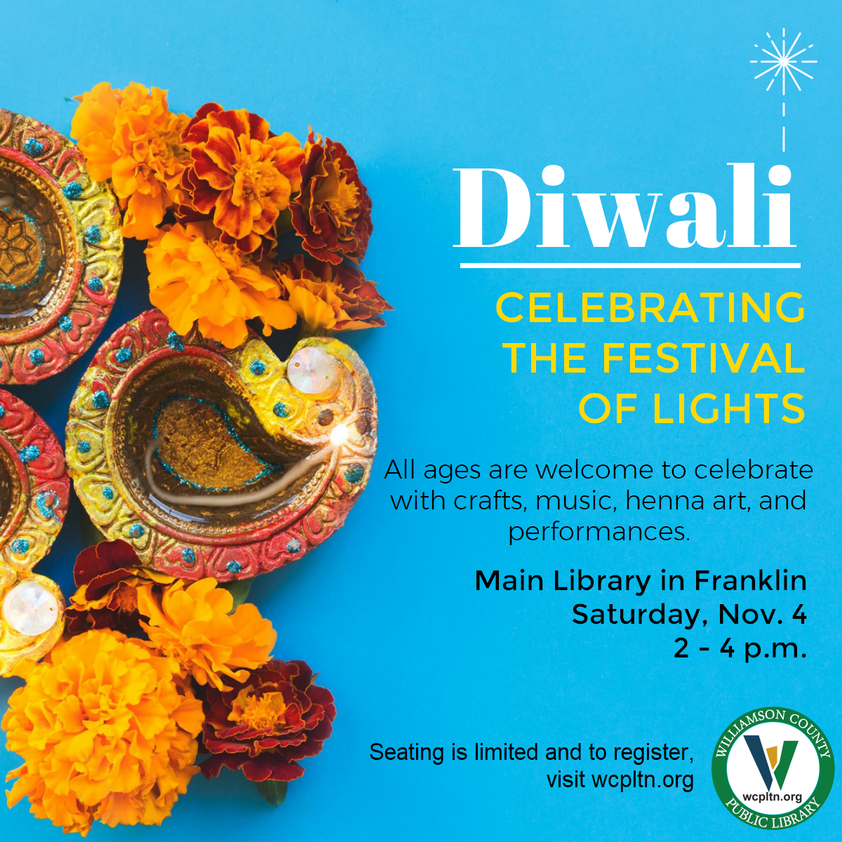 The Main Library in Franklin will celebrate Diwali, the festival of lights. This all-ages event will include crafts, music, henna art, and performances. Seating is limited and to register, visit wcpltn.org