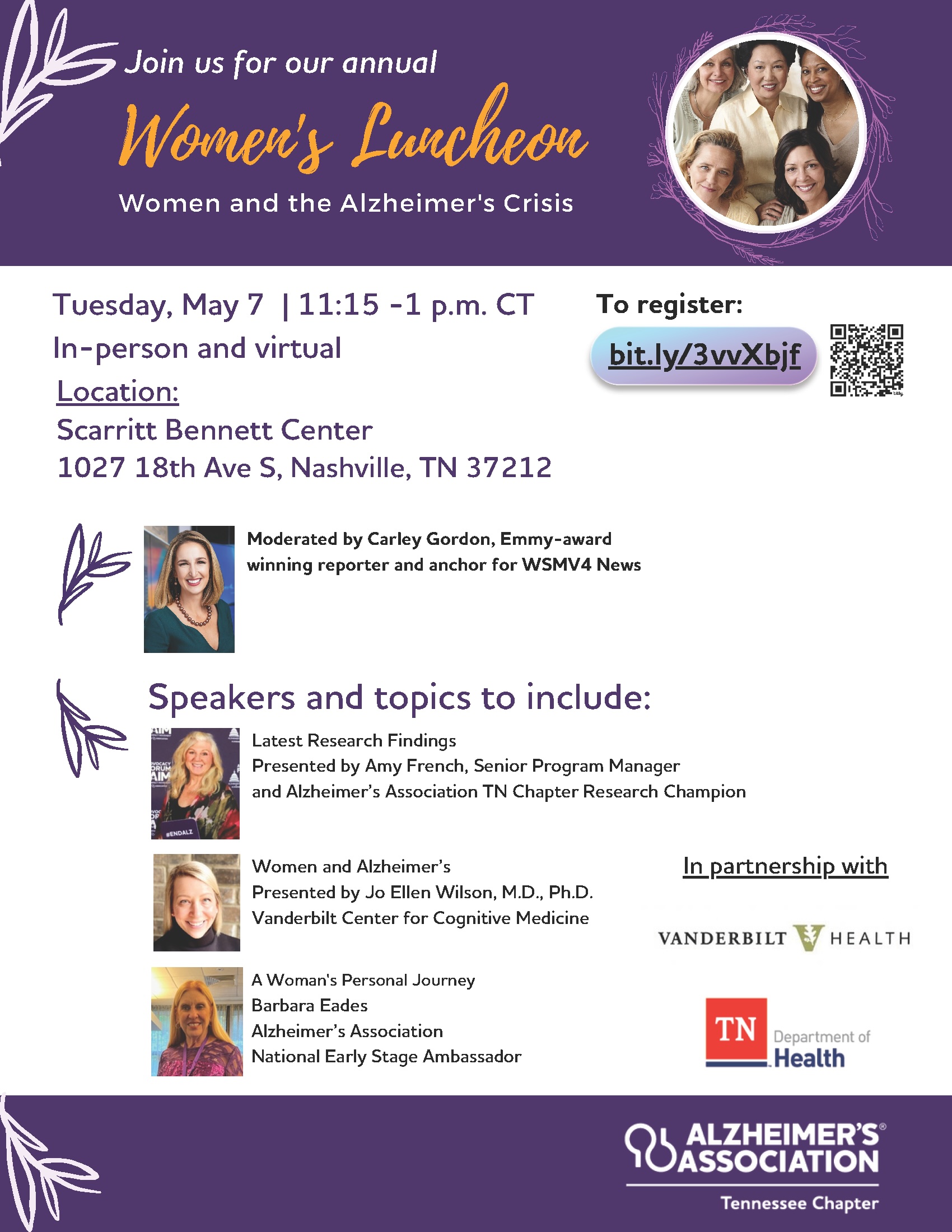 Did you know that over 2/3 of people living with Alzheimer’s are Women? And more than 60% of Alzheimer’s caregivers are women? Clearly, you are not alone! Join us for our Annual Women and Alzheimer’s Luncheon as we celebrate the strength and resilience of Women facing Alzheimer’s, beit as a person with the disease or as a caregiver. We will also learn about the latest in research and treatment, and how we can support and uplift each other on this journey!