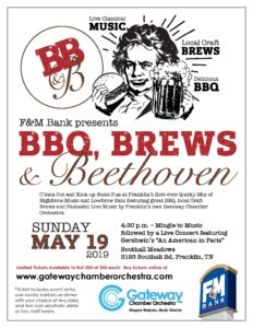 BBQ, Brews and Beethoven – three words not often associated with one another – but for two upcoming events, the Gateway Chamber Orchestra is hoping to change the way classical music is consumed. On Saturday, May, 18th in Clarksville and Sunday, May 19th in Franklin, the GCO is hosting live music performances paired with fun, networking, good eats and craft beer. “Many people view orchestra events as stuffy and high-brow. What we’re doing with BBQ, Brews and Beethoven is combining classical music with good local food and craft beer in a casual, unexpected location. We wanted to create an event that’s a quirky mix of music and food that will appeal to a lot more people, especially a younger audience,” says GCO Music Director Gregory Wolynec. Along with GCO’s live feature performance attendees can mingle to music and enjoy a savory BBQ plate with sides provided by Mission BBQ and local craft beers from Hand Family Companies or other non-alcoholic drinks.