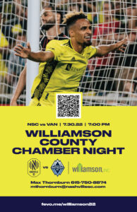 Nashville SC has put together a “Williamson County Chamber Theme Night” for their game on 7/30 vs Vancouver Whitecaps @ 7:00pm. Discounted tickets ($22) can be bought through the link: fevo.me/williamson22 This will be a great opportunity to meet people, network, watch soccer and enjoy everything Nashville SC has to offer at our brand new stadium Geodis Park! Look forward to seeing everyone out there!