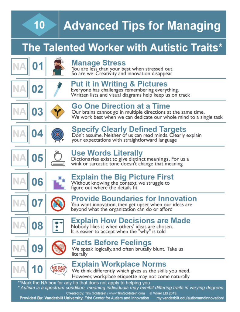 This resource provides ten tips for successfully supervising an employee with autism (or even just one who demonstrates autistic traits). Not all ten tips will apply to every employee, so we encourage you to present this sheet to your employee and have them indicate if any of the tips don’t apply, by checking the “N/A” box to the left.