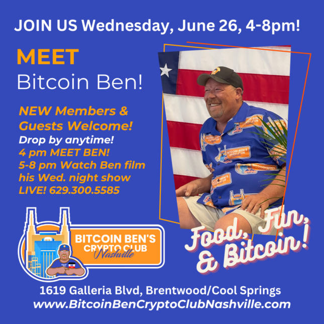 Join us from 4-5 pm to Meet Bitcoin Ben and then watch him in person film his Wed Night show from 5-8 p.m. the Nashville CLUB! Bring your family and…