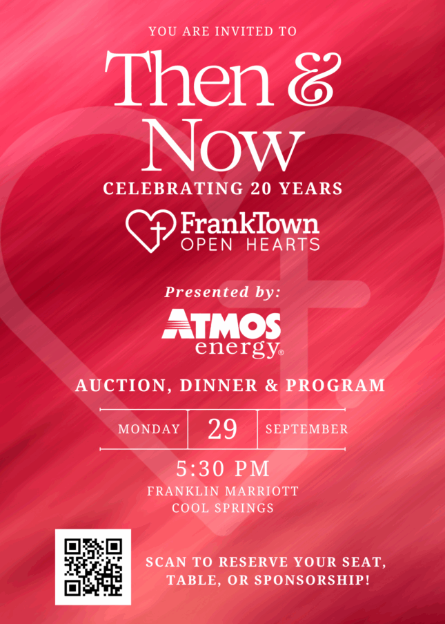 Join us for a transformative evening at FrankTown’s Annual Dinner-Then & Now on September 29, at the elegant Franklin Marriott Cool Springs. This special event will celebrate the incredible journey…