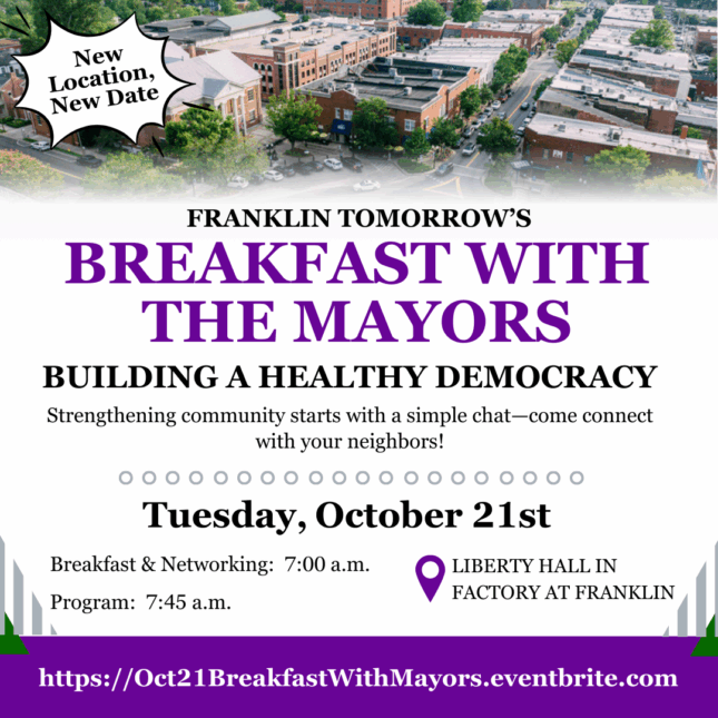 Don’t miss the final Breakfast With the Mayors, presented by Franklin Tomorrow on Tuesday, Oct. 21, at a new location at Liberty Hall at The Factory At Franklin. The public…
