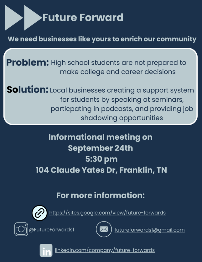 Future Forward is a student-led organization based out of Williamson County TN. Future Forward is dedicated to preparing the future generation of leaders to be career-ready. We want to work…
